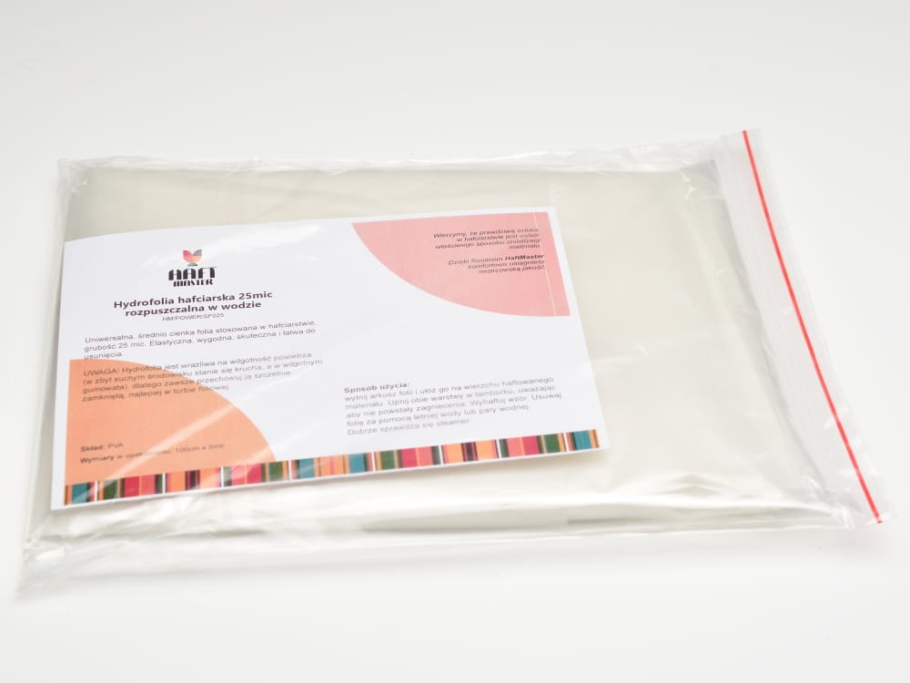 Kładziemy ją na wierzch materiału haftowanego. Dzięki hydrofolii nitka układa się równo na powierzchni materiału i haft wygląda lepiej. Usuwanie następuję poprzez wydarcie, a pozostałości usuwamy za pomocą mokrej gąbki lub szmatki. Pozostałości hydrofolii znikną całkowicie po pierwszym praniu ponieważ jest to materiał rozpuszczalny w wodzie.