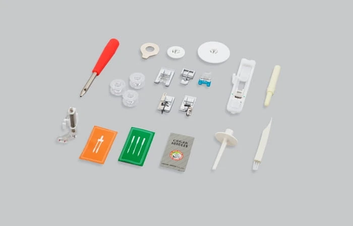 - różne stopki: do wszywania zamków, frędzli, tasiemek, pereł, kordonka, wypustek również z bizą, sznurka, z rolką, do rolowania, podwijania, marszczenia, z linijką, do patchworku, do patchworku z prowadnikiem, z centralnym prowadnikiem do łączenia tkanin, do quiltingu, krawędziowa, teflonowa, do przyszywania aplikacji, obcinacz krawędzi, prowadnik krawędziowy, lamownik i stopka z górnym transportem