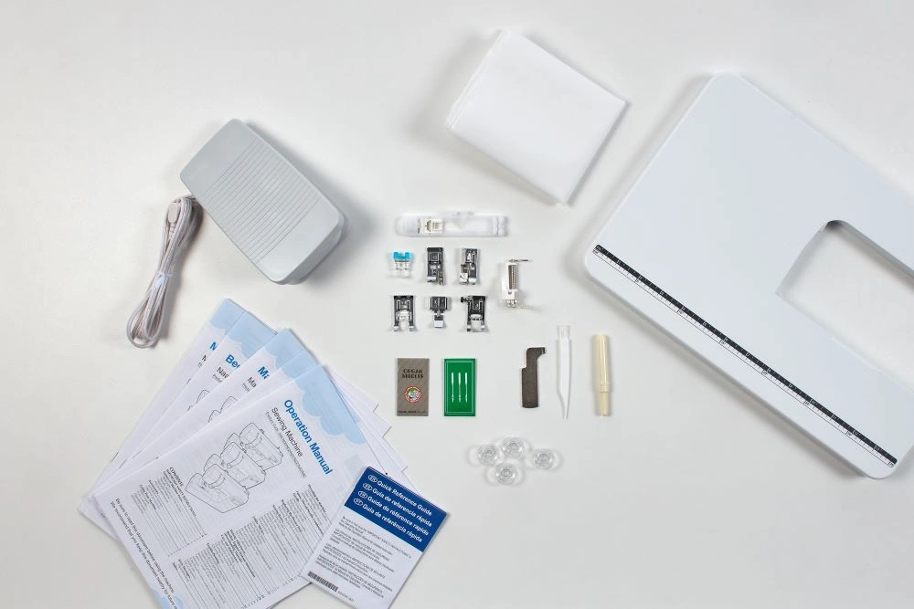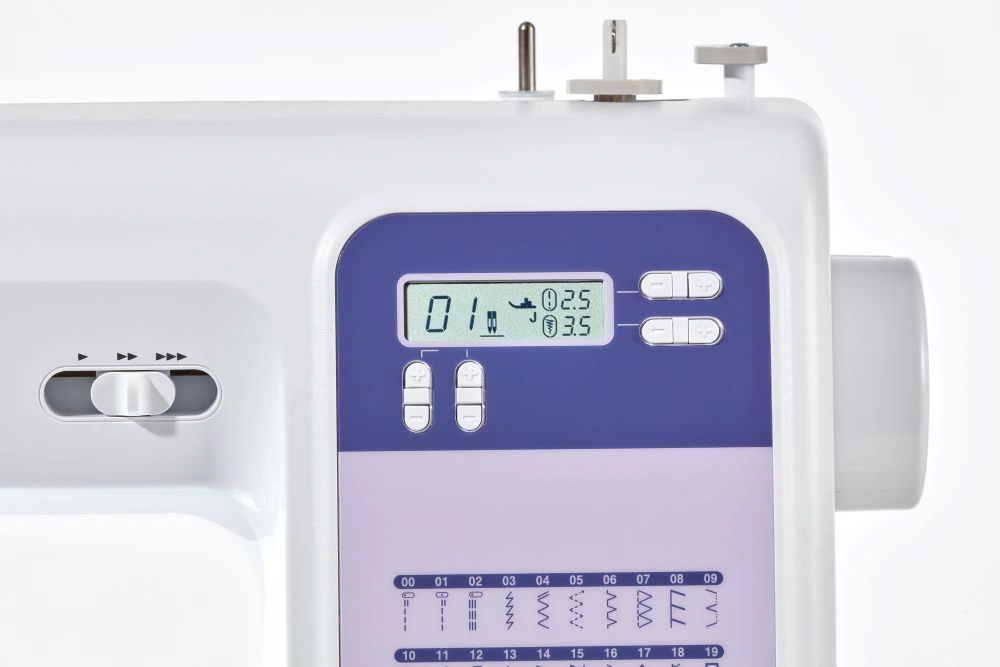 Czytelny wyświetlacz LCD informuje o szerokości i długości szwów, o wybranym wzorze oraz o ewentualnym rodzaju błędu. Maszyna ma możliwość pozycjonowania igły, wbudowany suwakowy regulator prędkości, przycisk szycia wstecz i system Start/Stop umożliwiający szycie bez pomocy regulatora.