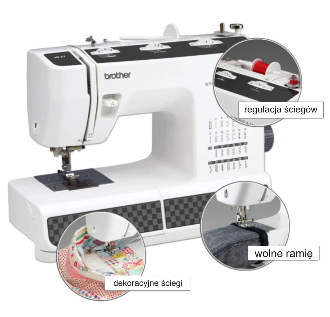 Maszyna Brother HF27 jest bardzo prosta w obsłudze i została wyposażona w 27 ściegów i program automatycznego obszycia dziurki, a także w nawlekacz igły i wyłączany dolny transport.