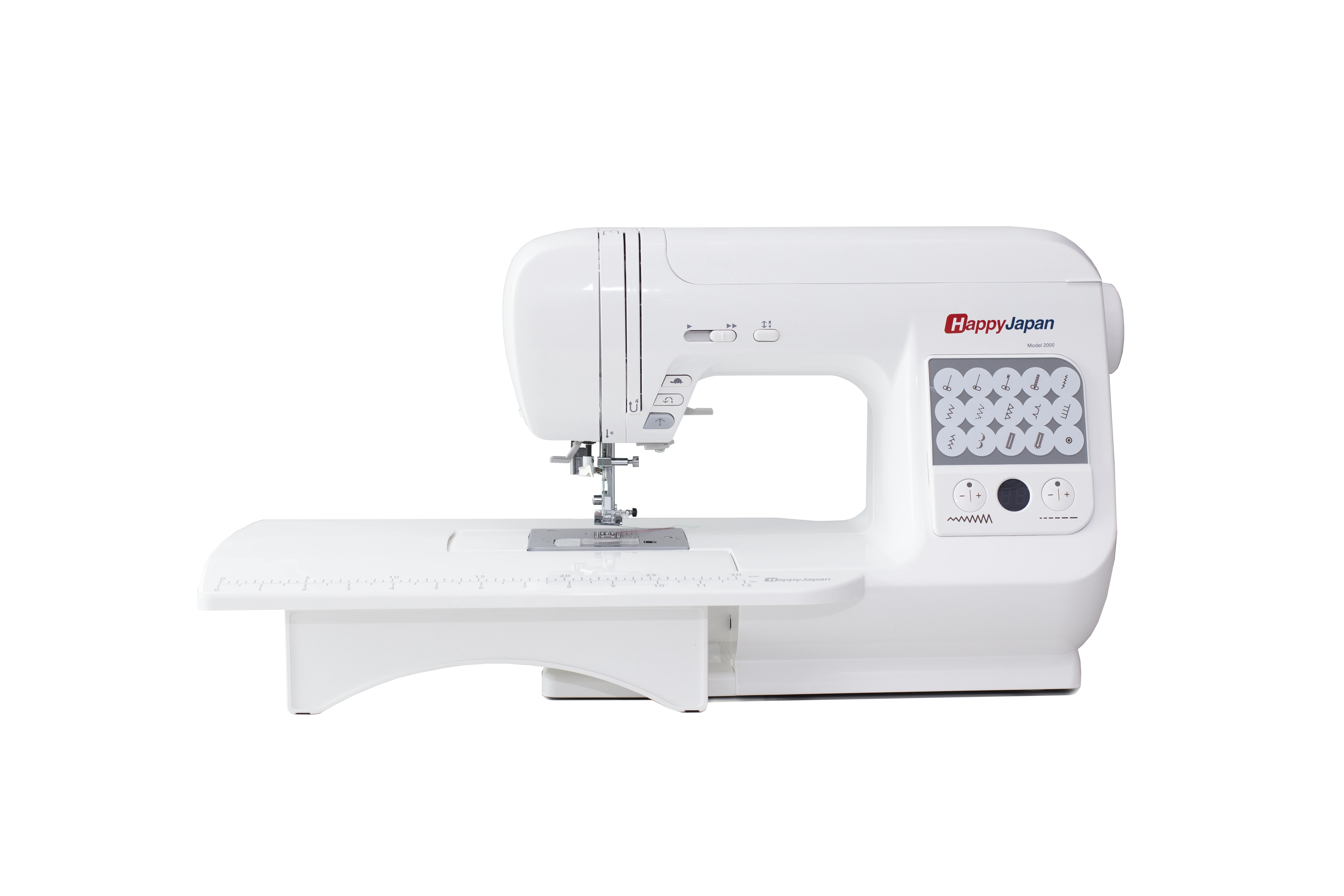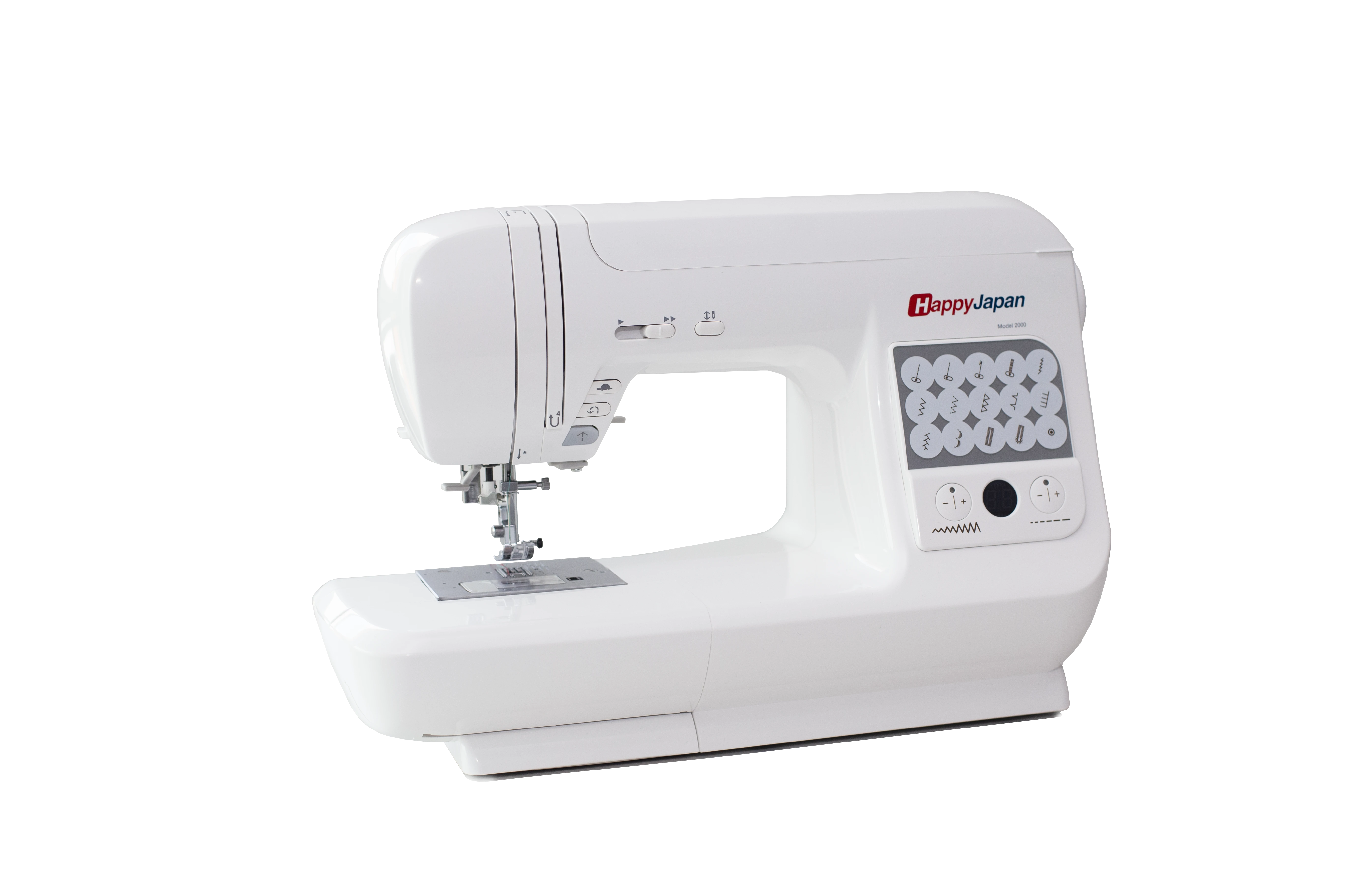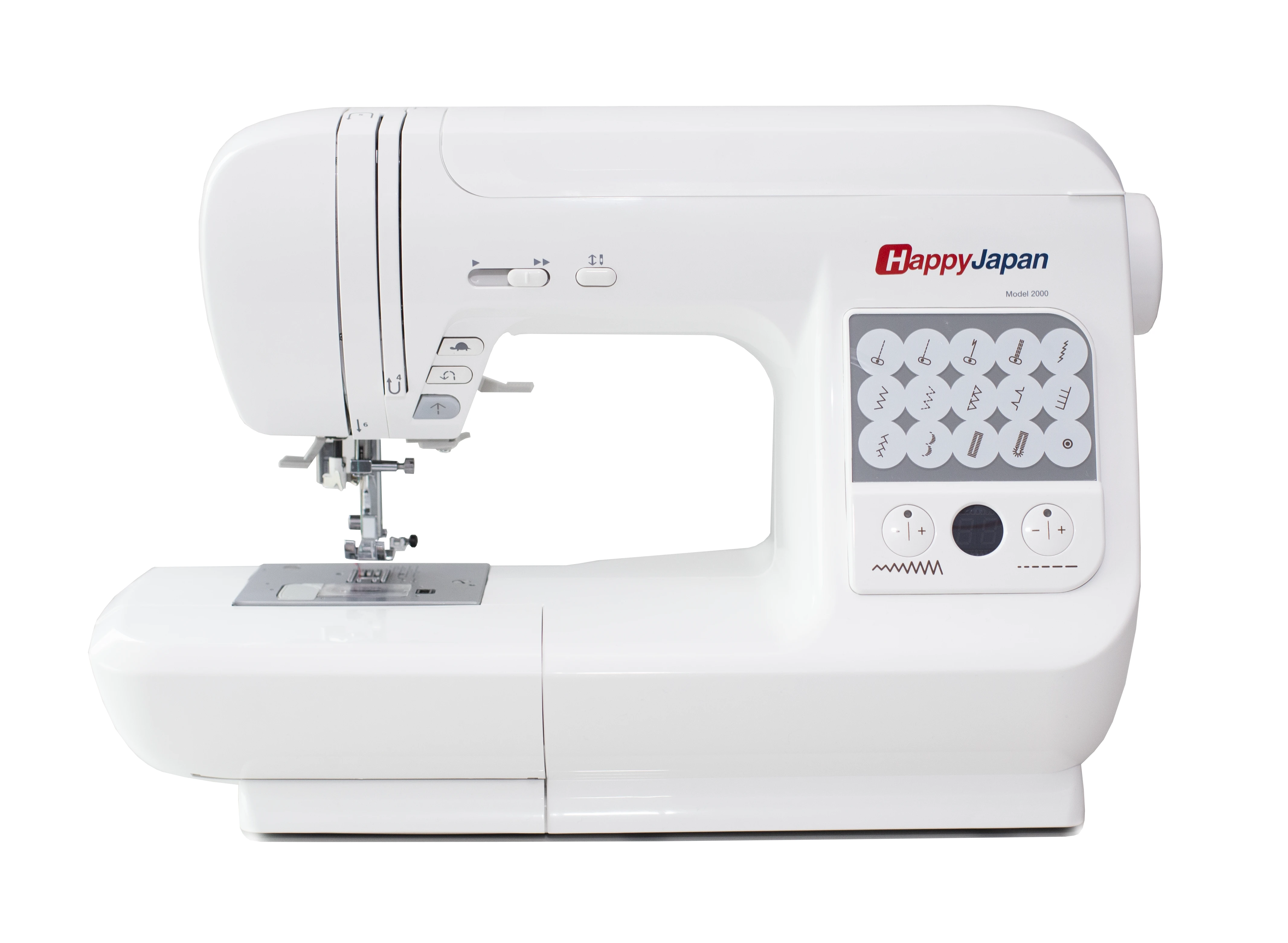 Maszyna jest bardzo prosta w obsłudze. Wyposażona jest w system bezpośredniego wyboru jednego z 14 ściegów, za pomocą wygodnych przycisków. Maszyna do szycia HappyJapan Model 2000 oferuje również funkcję automatycznego obszywania dziurek. Wystarczy jedno dotknięcie i już możemy szyć danym ściegiem, a dioda wskaże nam aktualne ustawienie maszyny do szycia. System ten docenią nie tylko początkujący, ale także profesjonaliści ze względu na znaczne przyśpieszenie pracy. Maszyna wyposażona jest we wszystkie niezbędne funkcje, jakie powinna mieć maszyna dla krawcowej. Elektroniczna regulacja długości i szerokości ściegu zapewni estetyczny wygląd dostosowany do naszego projektu. Parametry te ustawimy za pomocą wygodnych przycisków, a na wyświetlaczu sprawdzimy odpowiednie wartości. Wyłączany transport pozwala na pikowanie z wolnej ręki.